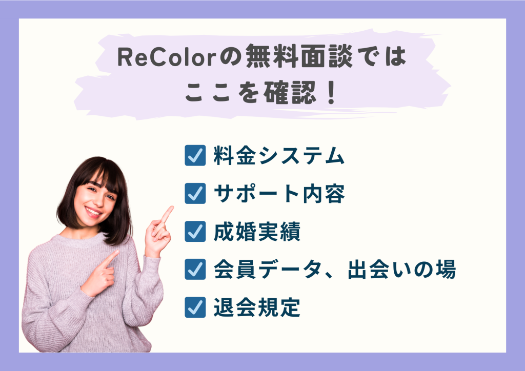 ReColorに限らず、入会金、月会費、オプション料金、成婚料など、すべての費用について明確に確認しましょう。