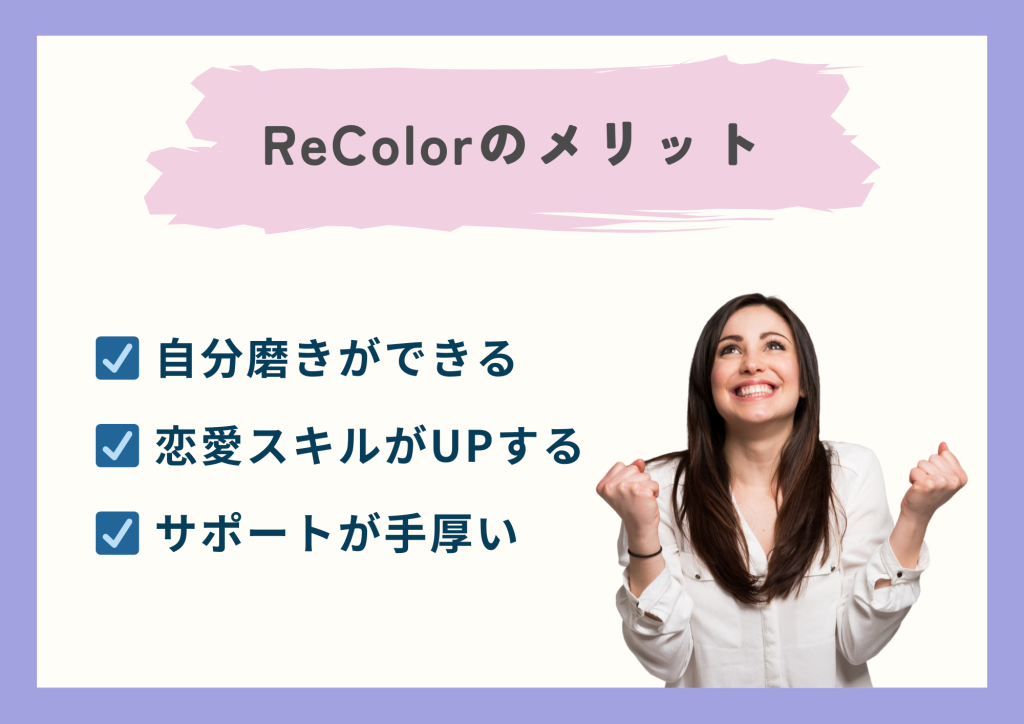 しかし、ReColorでは相手探しの前に、まず自分自身を理解し、魅力的な人になるための具体的な改善策を学ぶことに重点を置いています。