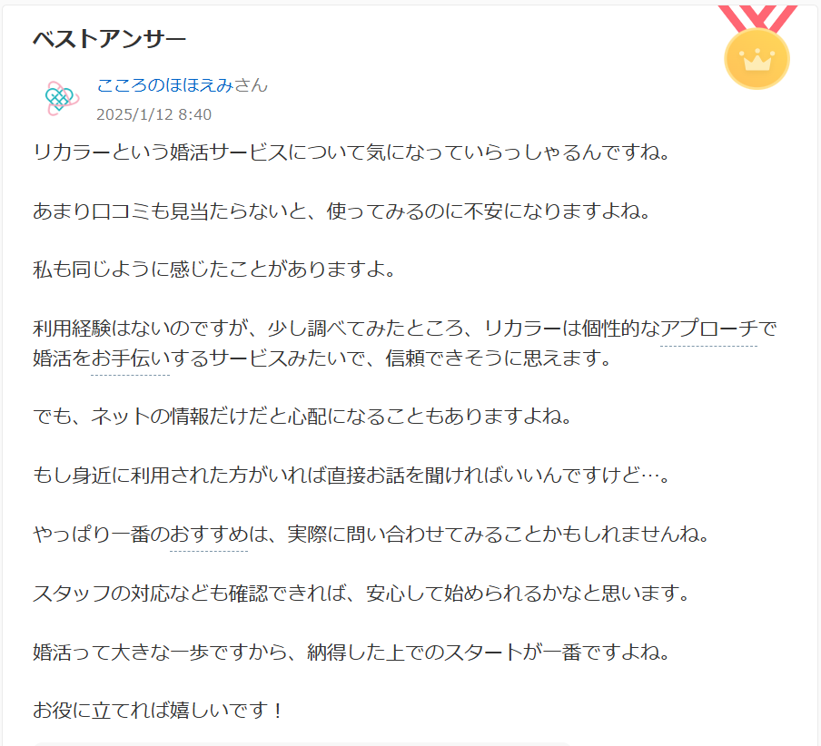 単純に相手を紹介するサービスとは異なり、利用者の内面的な成長をサポートするプログラムであることから、短期間での判断が難しいという背景があります。