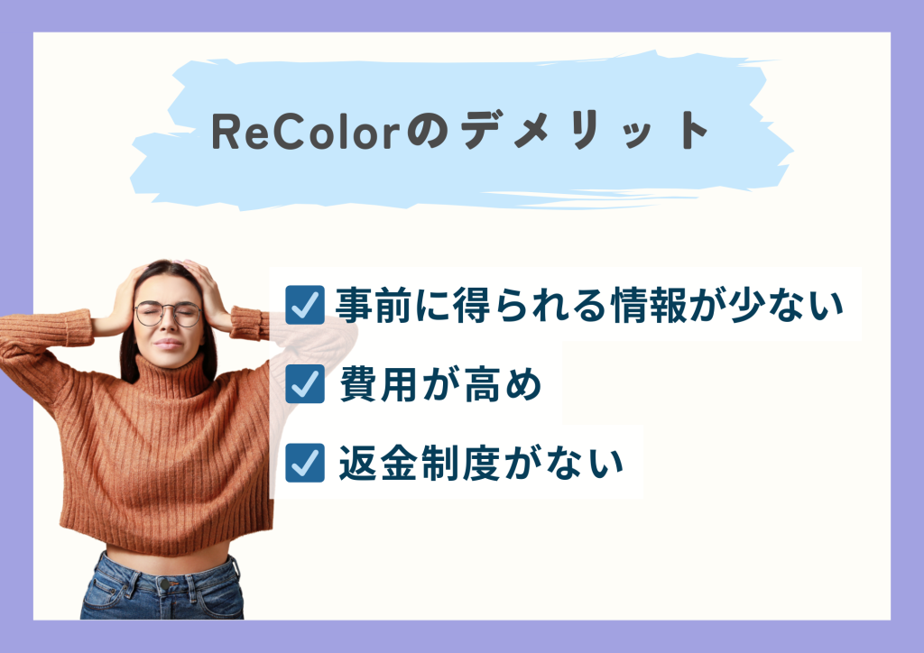 ReColorの料金設定は、高品質なサービスを提供している分、相応の費用がかかる点がデメリットとして挙げられます。
