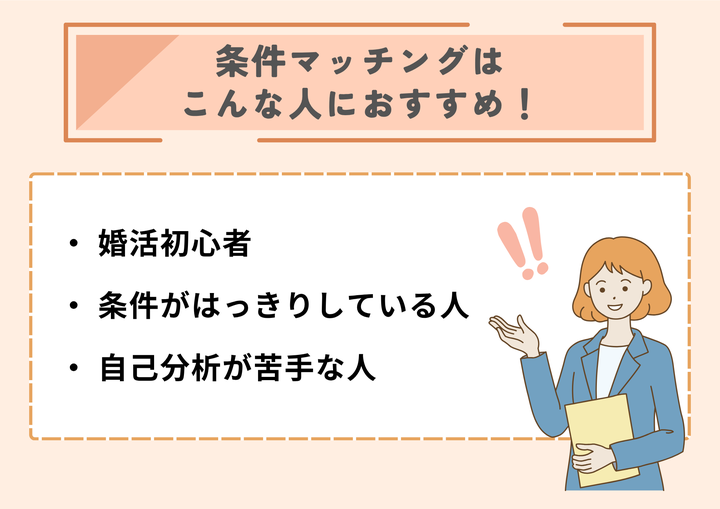 「年齢は◯歳まで」「職業は安定した仕事の人がいい」「地方在住はNG」といったように、結婚相手に求める条件が明確な方には、条件マッチングが非常に適しています。