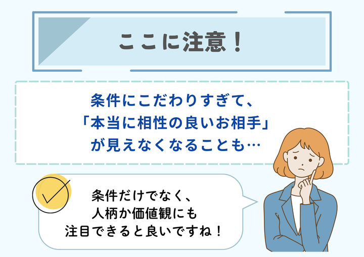 ただし、条件ばかりを気にしても性格の合う人に出会えなかったり、条件を絞り過ぎて紹介数が少なくなってしまったり、デメリットもあります。